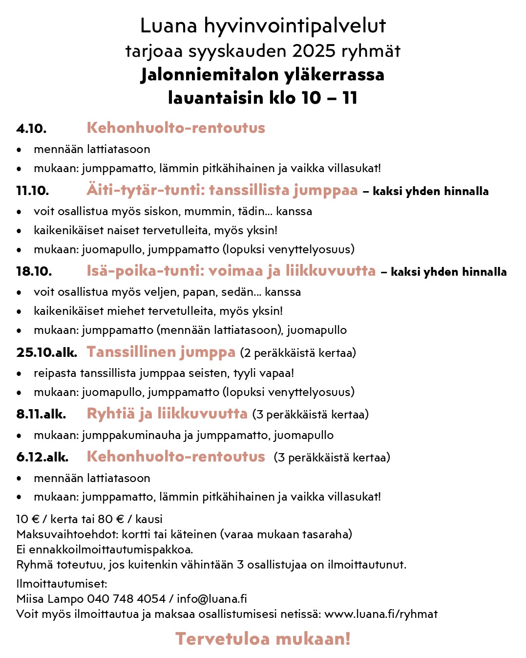 Äiti-tytär-tunti on tarkoitettu kaikille naisille, mutta erityisesti läheisten, esim. äidin ja tyttären, yhdessäoloon. Voit yhtä hyvin osallistua tunnille vaikka mummin, siskon tai kaverin kanssa, tai ihan yksinkin. Luvassa on tunnin verran hauskaa tanssillista jumppaa, jota tehdään seisten musiikin tahtiin. Jokainen pääsee varmasti mukaan helppoihin koreografioihin, ja ei haittaa, vaikka ei pääsisikään – oma tyyli paras tyyli! Emme pelkästään tanssi, vaan tunti yhdistää hauskasti tanssillisia liikkeitä tuttuihin jumppaliikkeisiin. Loppuun pidämme n. 15 minuutin venyttelyosuuden. Tunti on suunnattu pääosin yli 12-vuotiaille.